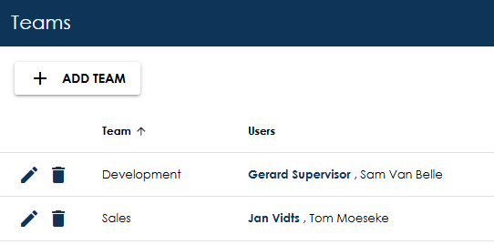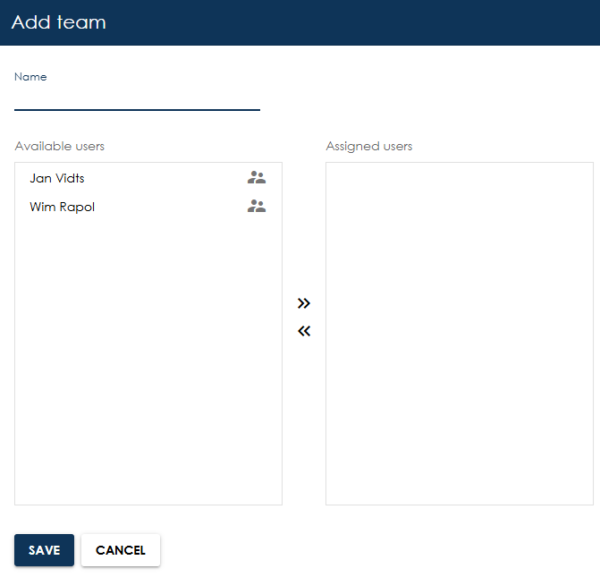 Available/Assigned users: this is a so-called transfer list. Move a user from one column to the other by clicking on his name. To move all users in one time, use the double arrows in between the 2 windows. When an icon with two figures appears next to the name, this indicates that the user has a supervisor licence. Multiple supervisors may be assigned to a team.