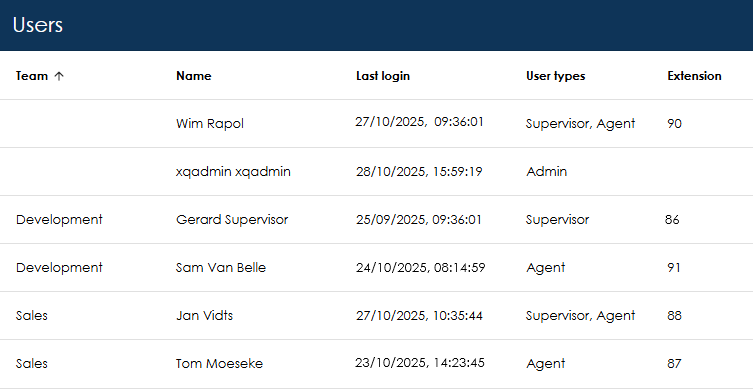 On this page, XQv Recording displays all users of the system. These include agents/users, supervisors and administrators. Who is granted which rights is determined entirely by the innovaphone PBX administrator. He assigns the apps and licences to users via the innovaphone UI. Consequently, this list is for reference only; it is not possible to select, edit or delete anything. However, the list can be sorted using the column headers.