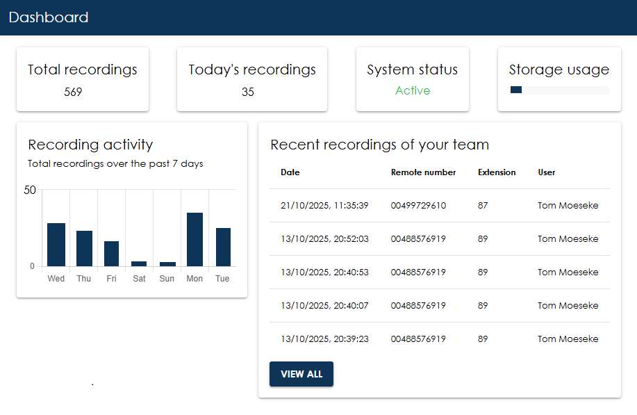 This page displays the most recent recordings of your team by default, but also allows you to search for specific recordings. This is done by using filters.